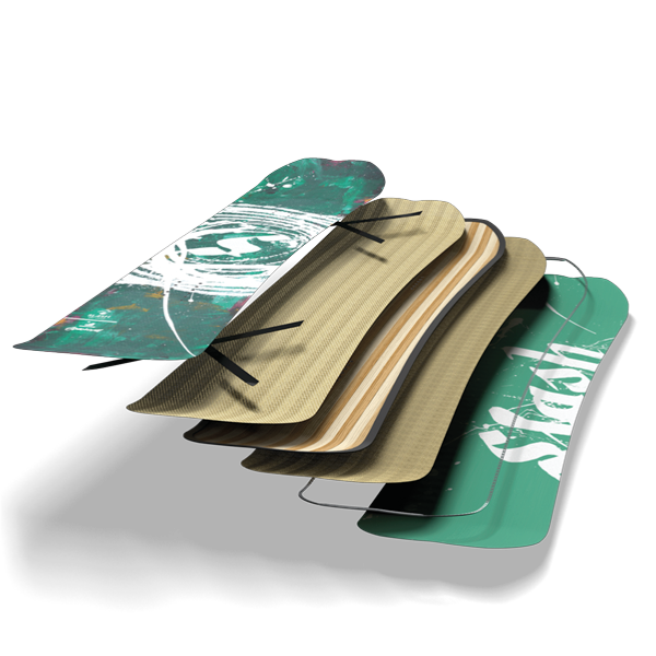 This is our ultimate truss of carbon, Kevlar and basalt fibers. The effect is lightness because the connecting strength of fiber allows us to slim the core’s thickness. With our strategic placement this gives certain liveliness to the board by adding response to the tips and leaving torsional softness between the feet.