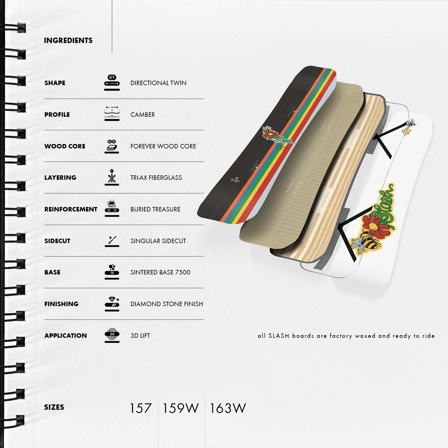 TRI-AX FIBERGLASS, FOREVER WOOD CORE, FACTORY WAXING: Tri-Ax Fiberglass is the time-tested classic. It provides superior pop, consistent torsional flex, and more overall response. ATV is constructed from 4 different lightwood wood species - paulownia, spruce, beech and poplar, which makes the board flyweight, durable, filled with pop and highly reactive. All Slash boards are factory waxed with OneBallJay wax and ready to shred straight out of the wrapper.